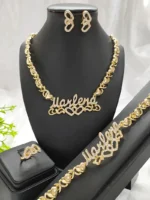 Indulge in luxury with this exquisite Necklace Set, perfect for wedding parties. With its opulent design and superior craftsmanship, this set features a necklace, bracelet, earrings, and ring. Make a lasting impression and elevate your style with this luxurious jewelry set.”