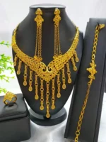 Indulge in luxury with this exquisite Necklace Set, perfect for wedding parties. With its opulent design and superior craftsmanship, this set features a necklace, bracelet, earrings, and ring. Make a lasting impression and elevate your style with this luxurious jewelry set.”