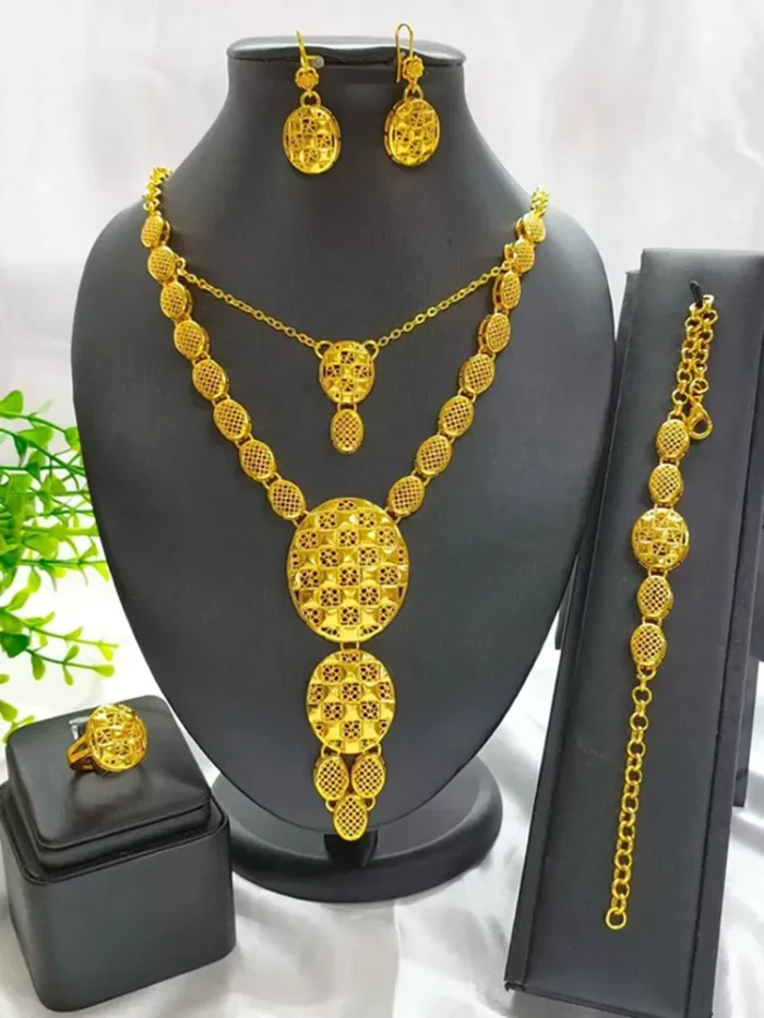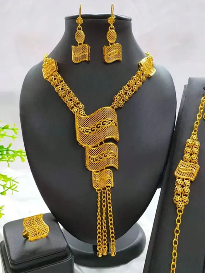 Indulge in luxury with this exquisite Necklace Set, perfect for wedding parties. With its opulent design and superior craftsmanship, this set features a necklace, bracelet, earrings, and ring. Make a lasting impression and elevate your style with this luxurious jewelry set.”
