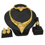 Indulge in luxury with this exquisite Dubai Gold Necklace Set, perfect for wedding parties. With its opulent design and superior craftsmanship, this set features a necklace, bracelet, earrings, and ring. Make a lasting impression and elevate your style with this luxurious jewelry set.”